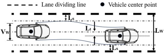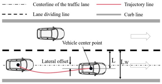 The lateral deviation of the vehicle’s driving trajectory refers to the horizontal distance between the vehicle’s center point and the lane centerline, as shown in Figure 3.