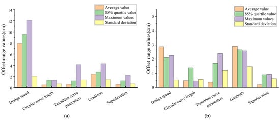 The analysis reveals that the design speed had the most significant impact on vehicle trajectory deviation. The gradient of the slope influenced vehicle speed to some extent, which in turn affected the accuracy of trajectory tracking. Due to the lower power performance of trucks, they are more sensitive to slope gradients, resulting in a certain speed differential. Both the design speed and the parameters of the transition curve significantly influence the standard deviation of the lateral deviation. The parameters of the transition curve directly determine the rate of curvature change in the transition curve segment. When the parameters are smaller, the rate of curvature change is higher, leading to faster steering wheel movements and causing greater fluctuations in the lateral sway of the vehicle’s trajectory.