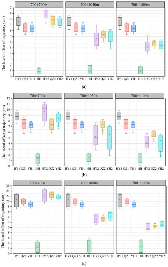 Boxplot of trajectory deviation for the general minimum radius of S-shaped curves: (a) the passenger car (100 km/h); (b) the truck (100 km/h); (c) the passenger car (150 km/h).