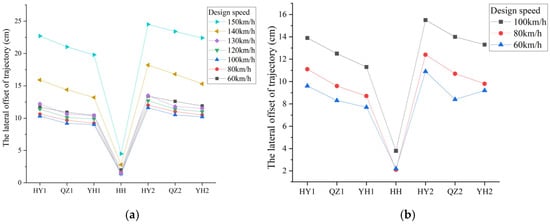 Trajectory deviation at various design speeds: (a) the passenger car; (b) the truck.