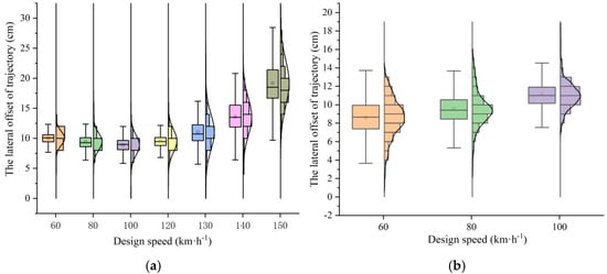 The trajectory deviation behavior of autonomous vehicles is a crucial basis for studying vehicle lane-keeping characteristics and lane-width design [10]. Based on the results of the multi-factor coupling analysis, vehicle speed was identified as a key determinant of trajectory deviation. Consequently, the relationship between design speed and trajectory deviation was modeled to provide a computational basis for determining the width of dedicated lanes in the next step. Using all the data obtained from the orthogonal experiments, a boxplot combined with a curve chart was plotted with design speed on the horizontal axis and lateral deviation on the vertical axis, as shown in Figure 7.