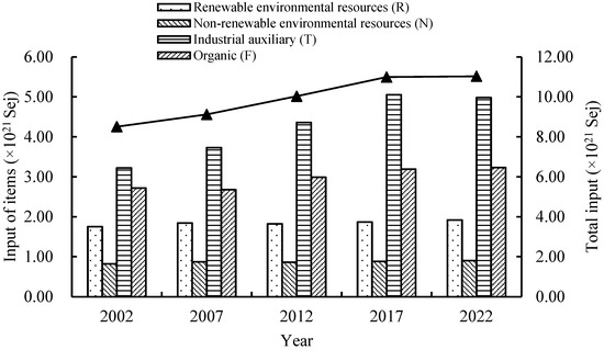 Changes in emergy input of agricultural ecosystem in Dazhou from 2002 to 2022.