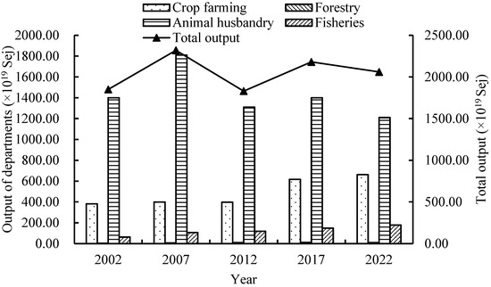 The total emergy output (EO) of AE reached its highest at 2.31 × 1022 Sej in 2007, while it was at its lowest at 1.83 × 1022 Sej in 2012. The EO of animal husbandry decreased from 1.40 × 1022 Sej to 1.21 × 1022 Sej between 2002 and 2022. The EO of crop cultivation increased from 3.81 × 1021 Sej to 6.61 × 1021 Sej. The EO of fisheries rose continuously from 6.26 × 1020 Sej to 1.78 × 1021 Sej. The EO of forestry grew from 3.26 × 1019 Sej to 1.12 × 1020 Sej between 2002 and 2017, but then slightly decreased to 1.02 × 1020 Sej between 2017 and 2022. These data of EO of AE in the study area are listed in Table 5.