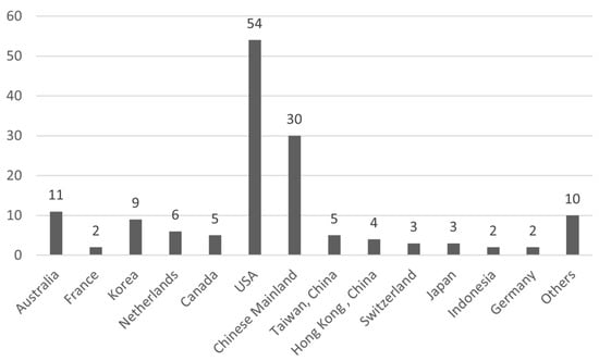 The first step was to conduct an extensive literature search regarding TOD performance. The search mainly focused on studies published in English. After reviewing many articles, a preliminary analysis of commonly used keywords on TOD performance was conducted to refine the screening process. The selection criteria for articles focused on titles containing “station area”, “transit-oriented”, “TOD”, or “transit station”, along with abstracts or keywords that included terms like “performance”, “influence”, “impact”, “effect”, “evaluate”, “assess”, “measure”, “encourage”, or “reduce”. These keywords served as the first-order criteria, and were combined using logical operators (“OR”) to form the second-order keywords. These terms were entered into various databases, such as the Web of Science, Elsevier, SAGE, and Taylor & Francis. The retrieved results, with publication dates up to June 2023, were saved as “Plain Text” with “Full Record and Cited References” yielding 347 articles. These articles were imported into literature management software (i.e., Endnote 4.0, NoteExpress 20) for inclusion and exclusion screening. The criteria were as follows: exclusions involved duplicate entries from different databases, articles irrelevant to the topic (i.e., those that do not discuss the influence of the built environment in terms of transportation, the economy, society, and the environment), and those merely citing others’ findings without in-depth discussion. The inclusion criteria focused on studies that clearly discussed the qualitative or quantitative relationships among built environment indicators or their relationship with TOD performance. Ultimately, 146 articles were considered valid for further analysis. Figure 1 shows the distribution of case studies, with nearly 40% focusing on TOD in the US and the others mainly considering the contexts of China, Australia, South Korea, and some European countries. There has been an especially significant increase in empirical research cases on TOD in China [5,8,19].