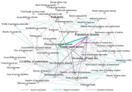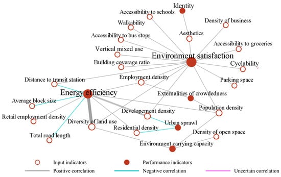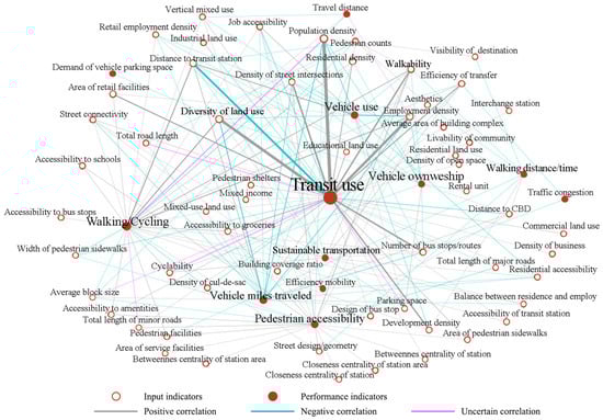 Figure 5 presents the relationships among the traffic performance indicators of TOD and their influencing factors using SNA. The figure reveals the following: