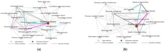 - The cliques formed among different input indicators, as shown in Figure 3, reveal symbiotic coexistence and mutual influence relationships among various built environment indicators. In the present analysis of TOD performance, the values of association among different inputs were obtained by calculating the degree of centrality of each key input constituting a clique. This approach made it possible to clarify and measure the features of associations among different indicators of the built environment, as indicated by a large number of empirical studies. This is evidenced in Figure 3a, in which factors such as the population density, diversity of land use, residential density, development density, density of retail facilities, closeness centrality of stations, betweenness centrality of stations, and street connectivity exhibit positive correlations. In Figure 3b, the employment density exhibits positive correlations with the diversity of land use, the density of street intersections, the residential density, the betweenness centrality of the station area, the accessibility of the transit station, and the job accessibility.