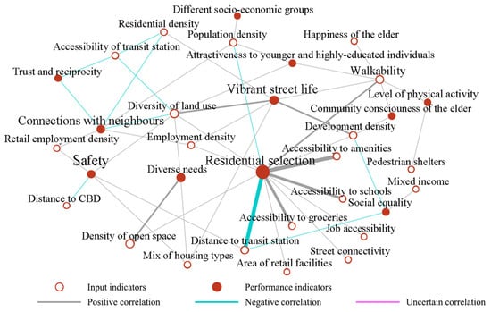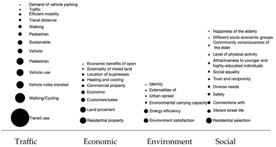 Figure 11 shows the social performance indicators of TOD and the correlations among their influencing factors obtained using SNA. The figure demonstrates that there has been a significant amount of research on the influences of diverse land use, walkability, the distance to transit stations, development density, and accessibility of amenities on TOD social performance. Taking into account the findings of the existing studies, the following were determined.