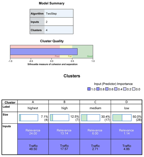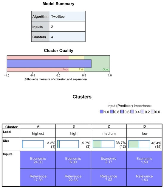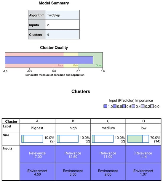 Four clusters were generated using the DCO and DOI indexes of the key indicators that impact TOD environmental performance (20 input indicators). A two-step cluster analysis was carried out, as shown in Figure 10. Appendix A Table A1 provides the statistics of the indicators and the categories of the clustering variables of the key indicators of TOD environmental performance. The results show that the clustering quality is in the “good” range. Clusters A (DCI: 17.00; DCO: 4.50) and B (DCI: 12.50; DCO: 3.50) have significant influences on TOD environmental performance. Cluster A represents the highest DCO of environmental performance and the highest DCI of factors influencing environmental performance, while Cluster B represents a high DCO of environmental performance and a high DCI of factors influencing environmental performance. The two input indicators in Cluster A (10% of the total) are the population density and diversity of land use. The two input indicators in Cluster B (10% of the total) are the development density and employment density. Cluster C (DCI: 11.00; DCO: 2.00), which represents a medium DCO and medium DCI, includes the residential density and the density of street intersections, and the remaining factors are assigned to a low DCO and low DCI.