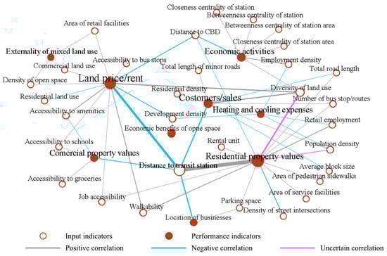 A systemic review of the input indicators affecting TOD performance considered in the extant literature was conducted (Appendix B, item 2). These indicators and their associations in relevant studies, as determined using SNA, are presented in Figure 2 (Appendix B, item 3).