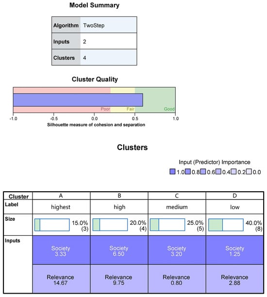 Four clusters were generated using the DCO and DOI indexes for the key indicators that influence TOD social performance (20 input indicators). A two-step cluster analysis was carried out, as shown in Figure 12. Appendix A Table A1 provides the statistical data on the clustering variables and the classifications of the impact factors of TOD social performance. The results show that the clustering quality is in the “good” range. Clusters A (DCI: 14.67; DCO: 3.33) and B (DCI: 9.75; DCO: 6.50) have significant impacts on TOD social performance. Cluster A represents a high DCO of social performance and the highest DCI of factors influencing social performance, while Cluster B represents the highest DCO of social performance and a high DCI of factors influencing social performance. The three input indicators in Cluster A (15% of the total) are the population density, employment density, and residential density. The four input indicators in Cluster B (20% of the total) are walkability, the development density, distance to transit stations, and the diversity of land use. Cluster C (DCI: 0.80; DCO: 3.20), which represents a medium DCO and low DCI, includes accessibility of groceries and amenities, and the remaining eight factors are assigned to a low DCO and medium DCI.
