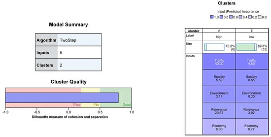 We performed an automated, two-step cluster analysis using the degree of centrality and the DCOs of each input’s traffic, economic, environmental, and social performance as variables. The basic features of the cluster analysis are shown in Figure 13, indicating two types of factors (with a total of 59 elements) for comprehensive TOD performance. The statistics for the indicators and categories of the clustering variables of the key elements in comprehensive TOD performance are shown in Appendix A Table A1. The results show that the clustering quality was in the range of “good”. In Cluster A, the DCOs for traffic, economic, environmental, and social performance were 40.00, 5.50, 3.17, and 8.33, respectively, and the DCI was 20.67, representing high DCO and high DCI. In Cluster B, there were 53 elements (89.8% of the total input elements). The DCOs of traffic, economic, environmental, and social performance were 4.89, 0.55, 0.30, and 0.77, respectively, and the DCI was 3.92, representing low DCO and low DCI. In Cluster 1, the six input elements (10.2% of the total elements) were the distance to transit stations, diversity of land use, population density, walkability, employment density, and development density. Therefore, these six indicators should be the focus of TOD construction in rail station areas to optimize comprehensive performance. Not only has their effect on TOD performance been widely confirmed in related studies, but they have also demonstrated significant associations with other factors (Table 1).