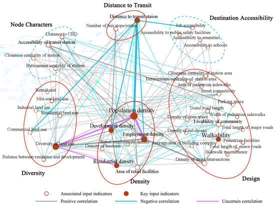 Due to the associations among various key indicators of the built environment, a combination of multiple key indicators can exert a greater impact [26,27,31]. Thus, the built environment indicators that are directly associated with the six key indicators (e.g., distance to a rail station, diversity of land use, population density) should become a focus for TOD construction and performance optimization in rail station areas. The results of the clique and node categorization analysis for the six input indicators are shown in Figure 14, revealing the following: