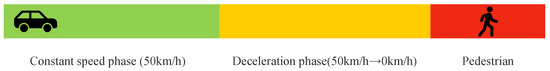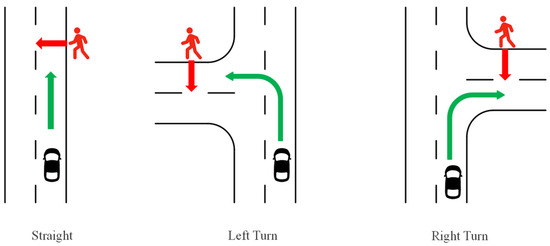 This study employs Unity 3D (version 2019.1.19) to construct a driving simulation environment miming a two-way, four-lane urban road setting. Each lane is 3.5 m wide with a speed limit of 60 km/h, and a greenbelt separates the opposing lanes to prevent incorrect driving. The simulation includes urban elements like building infrastructure, green spaces, and traffic signs to enhance realism. The vehicle-pedestrian interaction process is depicted in Figure 2. When a vehicle nears a pedestrian crossing within 60 m, the pedestrian begins to cross at a speed of 1.5 m/s. If the time to collision (TTC) drops below 3 s, different pedestrian warning icons are displayed on the vehicle’s windshield to alert the driver of potential hazards. Drivers encounter pedestrian crossing scenarios while going straight, turning left, and turning right at intersections, as illustrated in Figure 3.