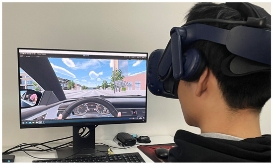 In recent years, developers have integrated eye-tracking technology into virtual reality (VR) systems using head-mounted displays (HMDs) as advancements in video-based eye-tracking have advanced [29]. This study employed the HTC VIVE Pro headset along with the HTC VIVE Pro Eye head-mounted eye-tracking system. The experimental setup included a workstation connected to the device for playing driving simulation videos and gathering eye-tracking data. The HTC VIVE Pro features dual 3.5-inch OLED displays with a resolution of 1440 × 1600 per eye, a refresh rate of 90 Hz, and a field of view of 110 degrees. The HTC VIVE Pro Eye can record eye movement data at 120 Hz with an eye-tracking accuracy of 0.5–1.1° and a visual angle of 110 degrees. The workstation is equipped with Tobii Pro Lab software (1.152) for collecting and analyzing the driver’s eye movement data. The specific device configuration and connections are depicted in Figure 4.