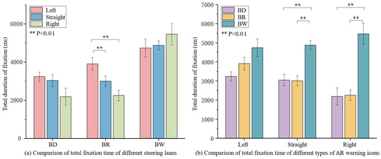 Figure 6a highlights drivers’ total fixation duration variations based on different turning lanes and three types of AR crash warning icon systems. The BD group shows a significant interaction between the type of AR warning icon and the turning lane, indicating a mutual influence between the two factors. However, within the same AR warning icon type, no notable differences in fixation duration are observed across different turning lanes in the BD group. This suggests that the impact of turning lanes on fixation duration is absent in this group. Therefore, in the BD group, the type of AR warning icon has a more substantial influence on drivers’ attention allocation.