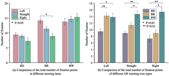 The fixation points for drivers under three types of AR crash warning icon systems across different turning lanes are illustrated in Figure 7a. The impact of turning lane on fixation points is not statistically significant within the BD group. Conversely, within the BR group, this impact is significant. There is no significant difference between the left-turn and straight lanes. However, the disparity between left-turn and right-turn lanes is statistically significant (p = 0.001). Moreover, the difference between straight and right-turn lanes is not significant. Lastly, within the BW group, the influence of turning lane on fixation points is not statistically significant.