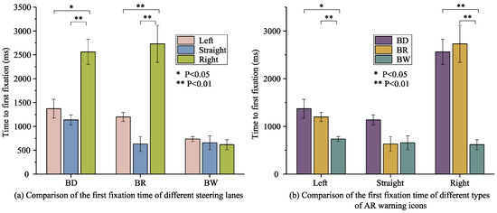 Specifically, under the left-turn road condition, the effect of AR crash warning icon systems on the first fixation time is statistically significant (F (2,22) = 5.793, p = 0.010). The difference between the BD group (1371.167 ± 197.780 ms) and the BR group (1198.971 ± 93.630 ms) is not statistically significant (p = 1.000). However, the difference between the BD group and the BW group (735.667 ± 52.66 ms) is statistically significant (p = 0.032). The difference between the BR group and the BW group is also statistically significant (p < 0.001).