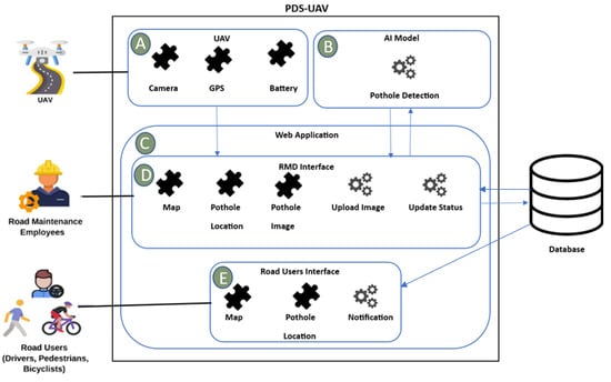 The proposed system, PDS-UAV, consists of three main parts: (A) UAV, (B) deep learning model, and (C) web application. The UAV is used for capturing road surface images and includes the camera, GPS, and battery. The deep learning model is responsible for pothole detection using deep learning classification methods (e.g., YOLO). Finally, the web application includes two different versions of the system, (D) and (E), customized for the two users’ categories. Part (D) is the web application designed for RMEs. It includes three components, the map, potholes’ locations, and potholes images. In addition, it includes two functions, uploading pothole images and updating pothole status. Part (E) is the web application designed for RUs, including drivers, pedestrians, and bicyclists. The RU web application includes two components: a map displaying the selected route based on the entered starting and destination points and map annotations to indicate the locations of detected potholes. Figure 1 shows all the components of the system and the interactions between these components.