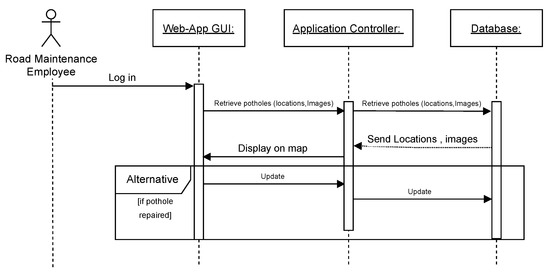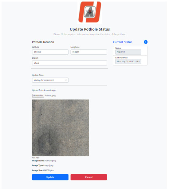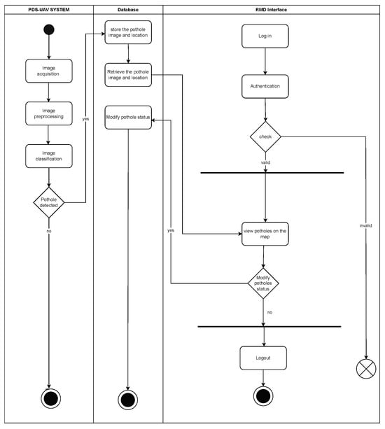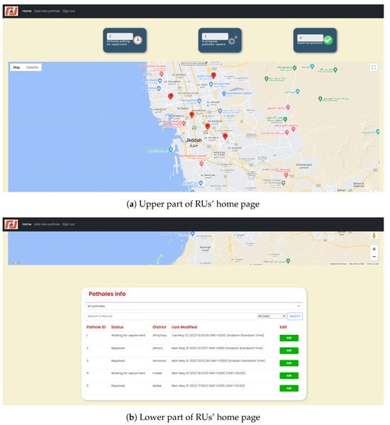 The system is operated as follows: the UAV captures video of the road surface, and frames (images) are extracted from this video. Then, the extracted images are uploaded to the system through the RME’s web application. The deep learning model performs the classification for pothole detection from the uploaded images. Classified images of potholes are stored in the system’s database along with their locations and relevant information. RMEs retrieve detected potholes’ information and view them on a map. Additionally, they can update the status of these potholes based on the progress of their repair. On the other hand, RUs retrieve potholes’ information and locations based on their routes by overlaying the pothole locations on the map and displaying information about the number of detected potholes on their routes, thereby allowing RUs to avoid these potholes and preventing their impact on safety or vehicle condition.