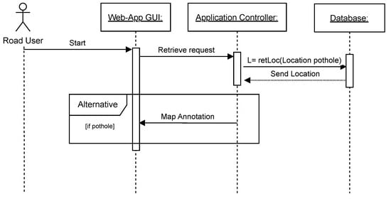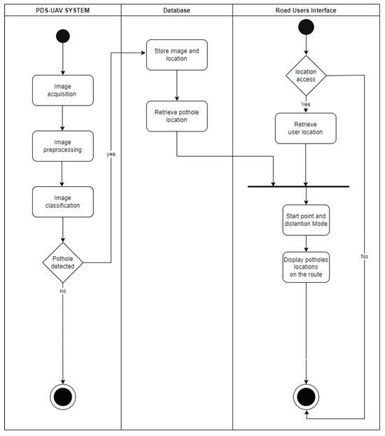 Figure 2 illustrates the use case diagram for the PDS-UAV system, highlighting the interactions between the system and its users. There are two primary user types: the RMEs at Jeddah municipality, and the RUs (driver, walker, or bicyclist). Each has different processes to run the entire PDS-UAV system. The RMEs sign up, log into the system, upload images and locations of potholes they encounter, view the locations of detected potholes on a map, update the status of potholes after maintenance, and log out of the system. The RUs allow the system to access their locations and view information about nearby potholes.