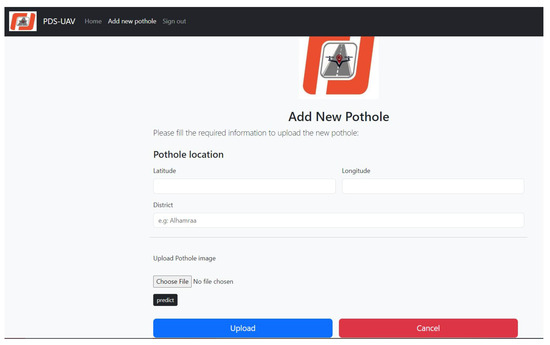 The PDS-UAV system includes three main components: the deep learning model, the web application, and the database. Python was used for the deep learning model, hypertext markup language (HTML), cascading style sheets (CSSs), JavaScript were used for the web application, and Firebase was used for the database. The hardware equipment needed for the proposed system includes a UAV to fly over roads and capture images to determine whether they contain potholes or not. A Laptop or PC is used to perform training and testing on the dataset. Additionally, a laptop (or PC) and a smartphone are required to run the applications. In the PDS-UAV system, a database is needed to store information and images of potholes, as well as the credential information for the employees at the road maintenance department in Jeddah municipality. The road maintenance department employees should have an email and password to access the system’s database. The data requirements for the RME include the employee’s first name, last name, password, phone number, and email. The pothole data requirements include latitude and longitude for geography, which describe the pothole location coordinates; an image of the pothole; the pothole’s district location name; and the pothole status.