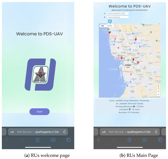 Future work will include developing a real-time system by integrating the system into the UAVs. In addition, it will focus on improving the website’s functionality and conducting further usability testing with a larger user base. Also, enabling a bilingual interface for the application using English and Arabic will make the web application more accessible to target users. Moreover, including real-time alerts for RUs based on their current location, and using banners and sounds would enhance their safety. The alerts should consider the safe distance that separates the RUs from the pothole based on their mobility mode (walking, driving, or cycling) so that they can take proper action at the right time to prevent the impact of these potholes on their safety. Furthermore, investigating the use of UAVs for other forms of infrastructure monitoring, such as traffic monitoring and control, might broaden the technology’s applications.