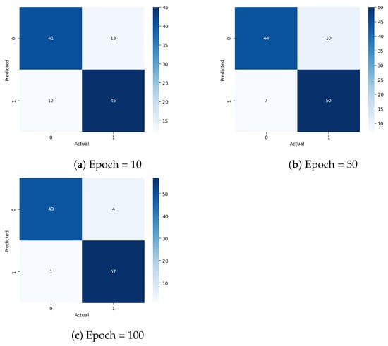 Based on the results presented in Table 3, YOLOv8 yielded the best performance with a precision of 98%, recall of 92%, and F1 score of 95%. Therefore, it was selected to be deployed in the proposed PDS-UAV system. The confusion matrix shows the correlation between the predicted and actual classes using YOLOv8 for the different number of epochs, with zero representing potholes and one representing non-potholes, as depicted in Figure 22.