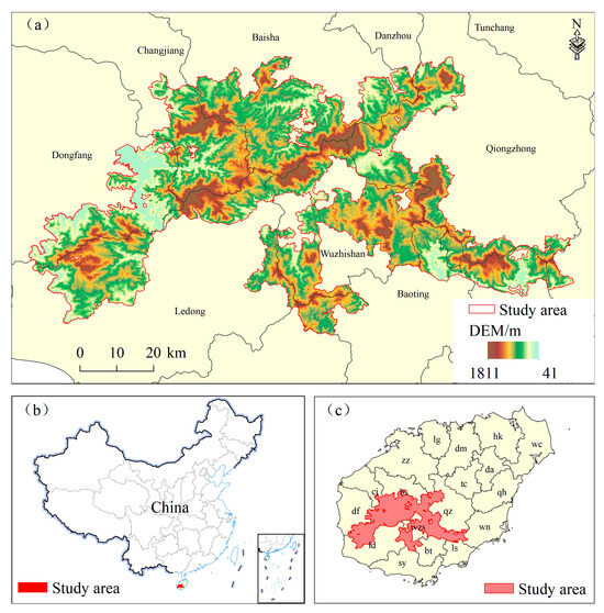 The DEM of the study area (a); the location of the study area in China (b); the location of the study area on Hainan Island (c).