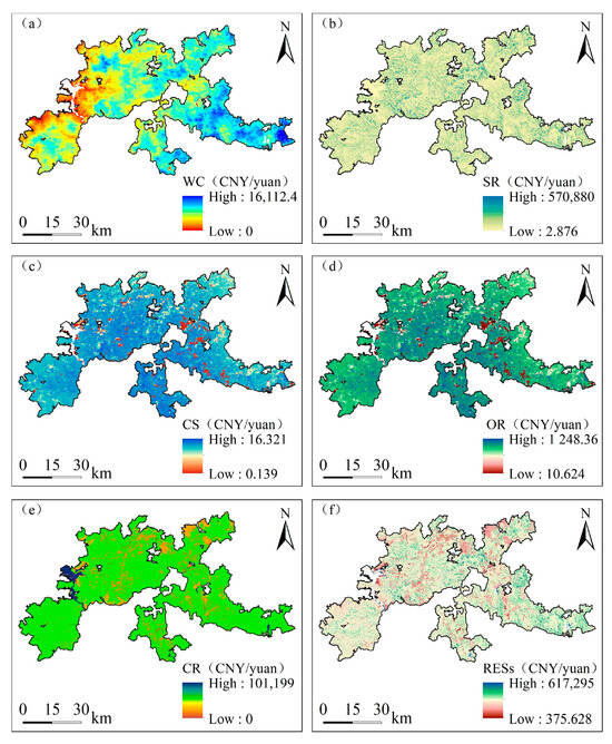 Using ArcGIS and the InVEST model, we obtained the biophysical quantities of RESs in HTRNP. By means of valuation methods such as Market Prices and the Surrogate Market, we estimated the monetary value of RESs in HTRNP. By adding up all numeric values, we obtained CNY 2090.67 × 108 as the total RES value of HTRNP in 2020. As a proportion of RESs, CR holds the highest value, accounting for 61.40%; WC and SR also have relatively high proportions, accounting for 20.21% and 15.74%, respectively. The value of CS and OR is the lowest, accounting for 2.84% of the total value. In general, RESs in HTRNP in the eastern and central areas are higher than those in the western area. However, different RESs reveal different spatial distribution patterns. For example, WC has “high value in the east and low in the west”; SR has “high value in central and low in surrounding areas”; CS and OR has “high value in central and low in surrounding areas”; and CR has “higher value in the west than other areas” (Figure 2).