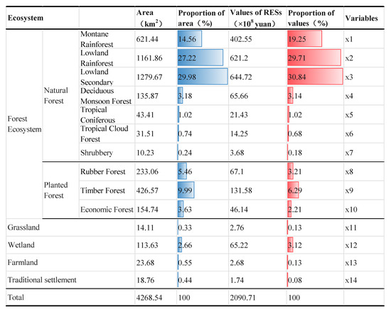 In terms of RESs’ total value, forest holds the highest value. The RES value of natural forest is CNY 1773.49 × 108, accounting for 84.82%, including lowland secondary rainforests (30.84%), lowland rainforests (29.71%), montane rainforests (19.25%), deciduous monsoon rainforests (3.14%), etc. The RES value of planted forest is CNY 244.82 × 108, making up 11.71%, in which the proportions of timber forest, rubber forest, and economic forest are 6.29%, 3.21%, and 2.21%, respectively. The RES value of wetland is also relatively high, totaling CNY 65.22 × 108, accounting for 3.12%, while that of farmland and settlement is lower than 1% (Figure 3).