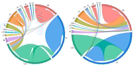 Chord diagram based on LULC in the short-term scenario (2030) and long-term scenario (2050). The abbreviations are the same as in Figure 4.