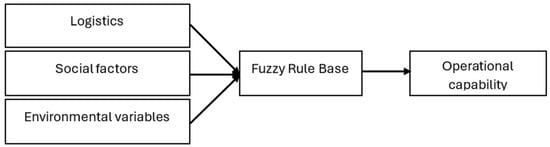 Based on a review of the theoretical foundations in this research, input variables including logistics, social factors, and environmental variables have been identified for assessing operational capability. Additionally, nine linguistic variables have been defined to measure these inputs comprehensively. The design of the fuzzy expert subsystem aimed at evaluating operational capability is illustrated in Figure 3.