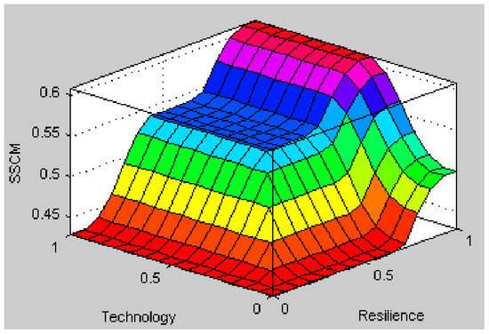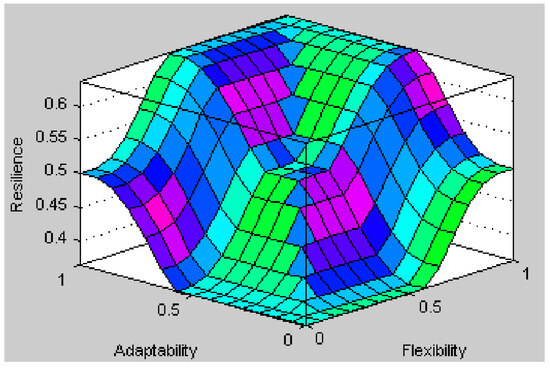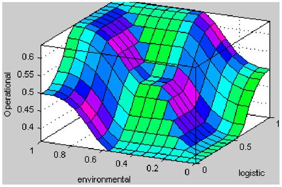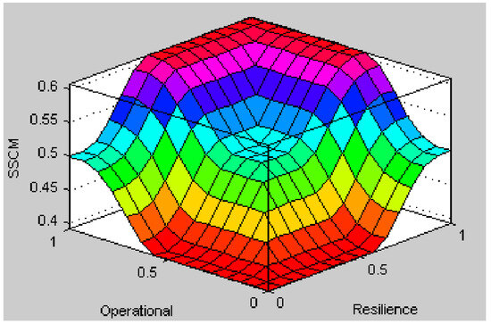 In this phase, the fuzzy rule base was developed by utilizing input linguistic variables and incorporating experts’ opinions through 30 “if-then” rules. The output of the three-dimensional operational capability model is depicted in Figure 4.