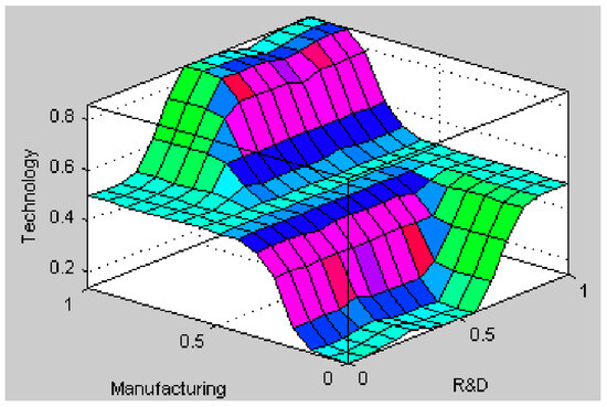 In this phase, a fuzzy rule base was established utilizing input linguistic variables and expert opinions, comprising 30 “if-then” rules. The output of the three-dimensional model depicting competitiveness is depicted in Figure 2.