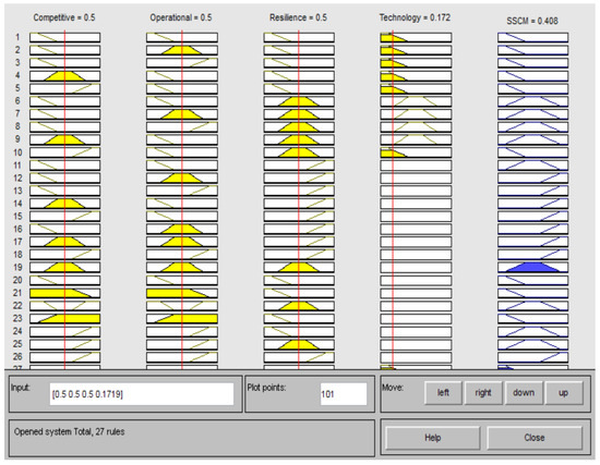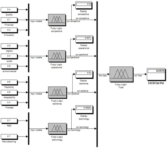 Based on the modeling of the fuzzy expert system using sustainable supply chain capabilities, encompassing competitiveness, operational efficiency, technology, and resilience, the final system modeling has been achieved in this section. Therefore, taking into account the essential concepts, variables such as the competitiveness, operational efficiency, technology, and resilience capabilities of the sustainable supply chain were defined as input variables, while the level of sustainable supply chain capabilities was defined as the output variable. The design of the fuzzy expert system for sustainable supply chain capabilities is illustrated in Figure 9, with model outputs depicted in Figure 10, Figure 11 and Figure 12. The Simulink tool was utilized for modeling and integrating fuzzy systems, as demonstrated in Figure 13.