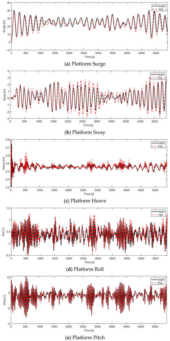Before constructing the fully coupled analysis model for the wind-wave combined power-generation platform, it is necessary to first validate the F2A method. This paper compares the results of OPENFAST-3.0.0 with those of F2A, selecting the motion response of a single platform for validation. Both methods use turbulent wind at the wind turbine’s rated wind speed of 11.4 m/s for verification, with the turbulent wind generated by the IECKAI turbulence model at the reference height of the turbine hub. The wave conditions are set as still water to eliminate the interference of wave seed randomness on the results. As shown in Figure 5, the time-domain comparison of the six degrees of freedom platform responses from both methods indicates good overall agreement, except for the surge and roll amplitudes where the F2A results show slightly larger amplitudes compared to FAST. This difference is primarily because the hydrodynamic coefficients in FAST are derived based on a center of gravity height of zero, which results in reduced stability compared to the original model, leading to greater motion amplitudes. Overall, the F2A method demonstrates high accuracy and is suitable for subsequent coupled motion analysis.