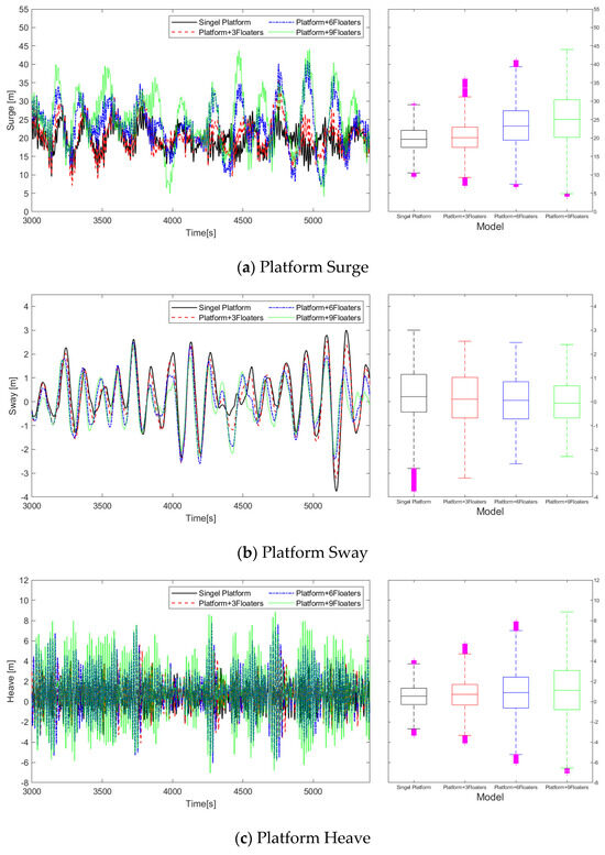 As shown in Figure 6, Figure 7 and Figure 8, the motion response comparison is presented for the platform with different floater array configurations under various wind speeds. The left side of each figure displays the time history curves, while the right side shows the box plots of the responses during the observed period. Firstly, considering the overall trend, the platform’s motion tendency is minimally affected by the floater array across the three different wind speeds, and the mean value of the motion remains largely unchanged, as indicated by the nearly constant median in the box plots. Further analysis of the three degree of freedom motion response under a wind speed of 4 m/s reveals that, in terms of motion extremes, the surge and heave motion extremes increase with the number of floaters. Notably, the heave motion extreme shows the most significant change, increasing from 0.24 m under a single platform to 0.43 m under a nine-floater array, a change of over 50%. In contrast, the pitch motion is less influenced by the floater array, with no significant changes in either its extreme or mean values. However, as the wind speed increases, although the heave motion response continues to follow the previously described pattern, the mean value of the platform’s surge motion gradually increases with the number of floaters, indicating a progressive deviation from the mooring’s original position. This suggests that as wind speed increases, the wind overturning moment gradually impacts the platform’s horizontal motion. At the same time, the pitch motion of the platform decreases with the increase in the number of floaters, reflecting the damping effect of the oscillating floaters on the platform’s pitch motion.