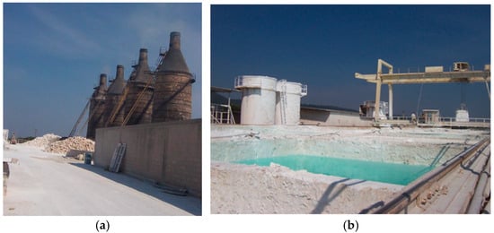 Figure 1a shows the production kilns of the vertical type with four natural draught side fireplaces and automatic lifting skips for loading limestone pebbles from the top. Kilns use wood production waste as fuel and reach temperatures of 900–1000 °C. The limestone pebbles descend into the kiln, encountering increasingly hot fumes in counterflow. In this way, a gradually fired, fat, white, and pure quicklime is produced. The quicklime is slaked in tanks where long-term aging of lime putty also takes place (Figure 1b).