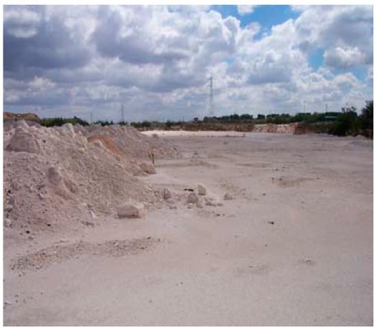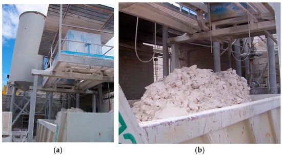 Figure 2 shows the tool with a water-cooled diamond blade used in the cutting and processing of the limestone rock. The sawing sludge is first subjected to sedimentation in a settler and then filter-pressed. Figure 3a,b illustrate, respectively, the filter-pressing system filter and the stone waste, SWS, at the end of treatment. A polyelectrolyte solution (flocculant) is added to sawdust sludge with a dosage of 70–80 mg per 1 kg of dry material before entering the settler to enhance the settling speed of solid particles. The cutting of 1 m2 of stone requires an average of 10 L/min of water and produces around 18.5 kg of filter-pressed SWS. The collected SWS is transported to landfills for inert materials, typically located in decommissioned quarries, and utilized until their filling (Figure 4).
