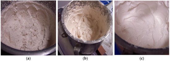 Figure 5 shows the appearance after mixing the three samples of coarse plaster, fine plaster, and finishing. For each sample, a mass of 900 g was used for consistency measurement with the spreading test. The remaining quantity was used for the applicability tests on perforated brick. The consistencies of the mortars are different from each other as the aggregates used are of decreasing grain size, starting with the coarse mortar and ending with the finishing plaster.
