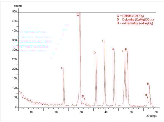 Mineralogical analysis was carried out by X-ray diffractometry. Figure 6 shows the diffraction pattern of the fine powder sample. The X-ray pattern was compared with the Jade Library Joint Committee on Powder Diffraction Standards (JCPDS) card. Results show that the main phase is calcite (CaCO3), Dolomite (MgCa(CO3)) and hematite (α- Fe2O3) were detected as compounds in traces.