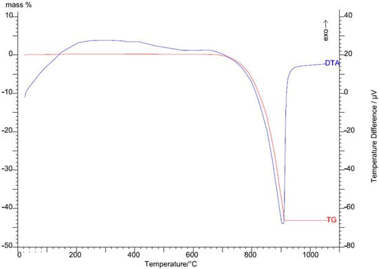 Figure 7 illustrates the results of TG-DTA. The differential temperature curve shows an endothermic peak at the temperature of 900 °C at which the calcination reaction takes place with the formation of calcium oxide and the release of carbon dioxide [64,65], according to the following Equation (1):
