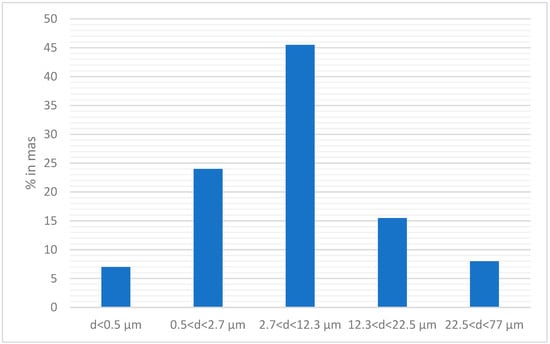 Figure 8 shows the particle distribution obtained by the laser diffraction method. The maximum particle size, expressed as equivalent diameter, is equal to 77 μm. It can be observed that only 8% in mass have a particle size ranging between 22.5 μm and 77 μm, while the remaining 92% in mass have a particle size below 22.5 μm, with 7% in mass having a particle size below 0.5 μm.