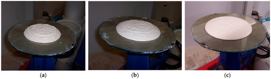 In regard to the particular research that examines the preparation of plasters and finishes, the behavior in the fresh state is of paramount importance, as these are materials that are primarily dependent on good workability and applicability. The workability of the materials was therefore evaluated through the use of spreading tests. Figure 9 shows the samples of coarse mortar, fine plaster, and finishing plaster after the mold lift during the spreading test.