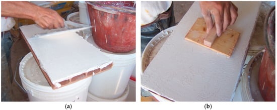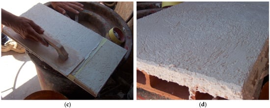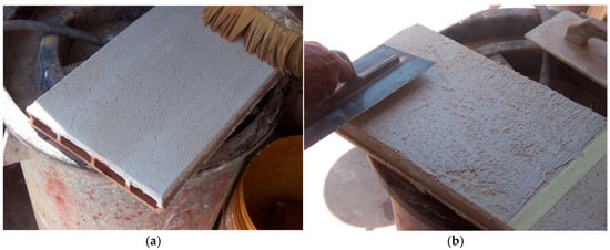 Figure 10, Figure 11 and Figure 12 show the applicability tests of coarse mortar, fine plaster, and finishing plaster, respectively. The sample of coarse mortar was applied on the surface of a perforated ceramic slab, previously impregnated with water applied with a brush. The first layer of 0.5 cm was applied using a steel trowel. The second layer of 0.5 was applied when the surface began to harden (whereby no more marks were left by touching the surface). Finally, before the second coat was completely dry, the surface was worked over with the wooden trowel with circular movements that allowed it to drag the larger granules of aggregate and give rise to small grooves on the surface. The roughness of the surfaces obtained in this way of application ensures good adhesion of the subsequent layers.