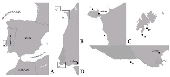 (A) Section of the western continental Portuguese coast where the deployments took place. Three distinct zones were selected: (B) The coast of Peniche, with Marques-Neves as the reference Kelp forest (I) and Consolação (II); (C) In the Berlengas Islands at the sites Elefante (III) and Galos (IV); (D) and in the Cascais area at Boca do Inferno (V).