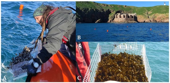 More recently, a new approach to reforesting Kelp forests has been gaining traction, the “green gravel” method [24]. With this technique, small rocks are sown with macroalgae propagules and reared in laboratory conditions, later being deployed or out planted in designated areas [24]. Green gravel has been applied effectively in different regions, providing an efficient, cost-effective, and easily up-scalable methodology. It requires relatively little economic investment and can be applicable to a variety of species, with each workgroup adapting it to a species of ecological reference within their geographical area [25,26]. Moreover, it does not rely on transplanting other adult specimens from neighbouring communities or rearing specimens to adulthood in the laboratory, representing an ethically and economically sustainable alternative [24]. However, this technique is certainly not flawless. Some of the main concerns are the introduction of foreign substances into the ocean [19], the susceptibility of the small Kelps attached to the rocks to high wave exposure [27,28], or herbivory [17,29]. Even so, the promised efficiency and cost–benefit [24] seem to possibly outweigh some of these concerns, and consequently, restoration trials using green gravel as the restoration method were conducted on the continental Portuguese Western Coast.