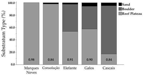 Percentage of each bottom substratum category (reef plateau, boulders, and sand) measured in 25 m transects at the different studied sites (n = 5). Numbers within each bar indicate the site’s Rugosity Index (RI) achieved (n = 5).