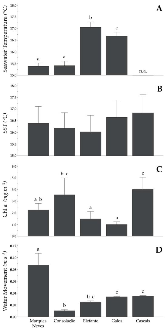 (A) Average seawater temperature (measured in situ); (B) sea surface temperature—SST; (C) near surface chlorophyll a level—Chla a, and (D) absolute average water movement in all monitored sites. Statistically significant different groups (a, b, and c) are shown (Tukey’s HSD; p ≤ 0.05). Error bars are ±2 sd of means (n.a. = not assessed).
