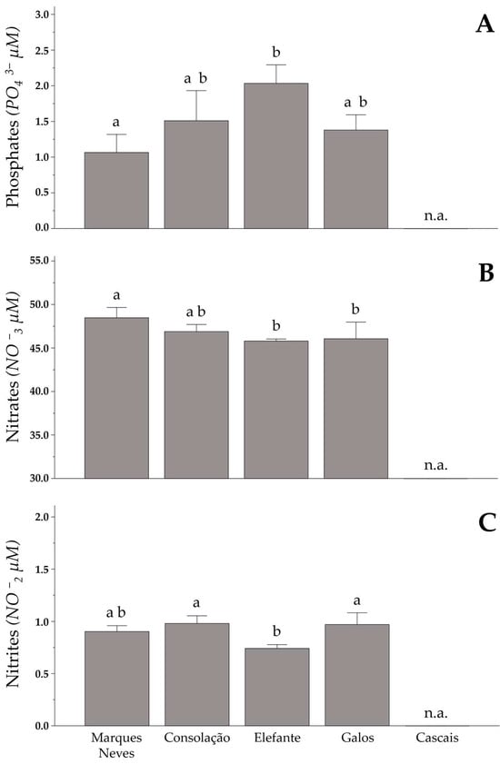 Nitrate concentrations (NO3−) (Figure 5B) also varied significantly (F (3, 43) = [3.91]; p = 0.02), with Marques-Neves having the highest mean concentration at 48.5 ± 2.5 µM. The remaining areas exhibited statistically similar concentrations among themselves (p > 0.05). Within this group, Cascais had the higher nitrate concentration at 46.9 ± 1.6 µM, while both Berlengas sites had significantly lower nitrate levels (p ≤ 0,05) than our reference site, with Elefante at 45.8 ± 0.3 µM and Galos at 46.1 ± 2.2 µM.